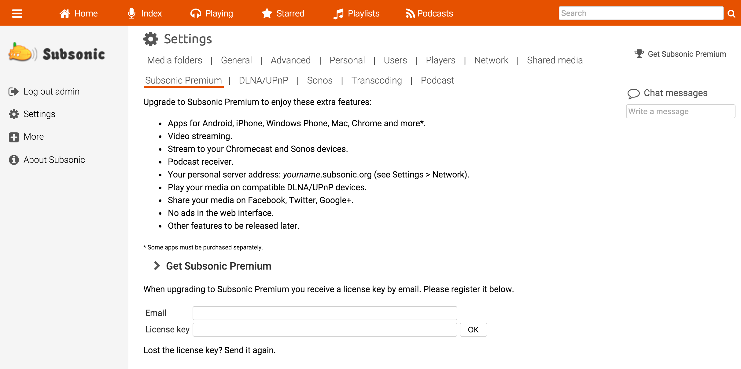 - Click the "Get Subsonic Premium" link in the top right corner of the Subsonic web interface.