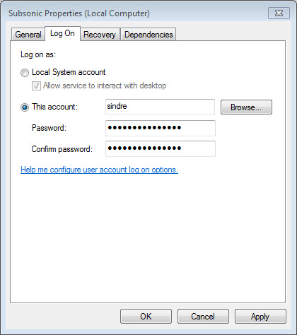 For improved security you can turn on https encryption. On Windows, open the Subsonic Control Panel by clicking on the Subsonic tray icon, then enable https on the specified port (default 443).